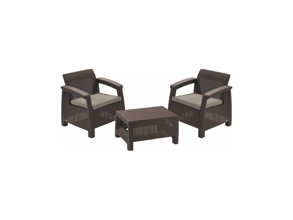 Souprava je vyrobena z lisovaného plastu v imitaci plochého ratanu.