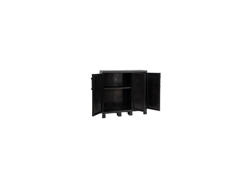 Praktická plastová třídvéřová skříňka GARAGE MIDI TRIO LOW v černé barvě. ODOLNÝ RECYKLOVANÝ MATERIÁL Skříňka GARAGE MIDI TRIO LOW je vyrobena z vysoce kvalitního recyklovaného materiálu, který zaručuje nejen dlouhou životnost, ale také podporuje naši snahu o udržitelnost a ochranu životního prostředí. Jednoduché otevírání prostřednictvím hliníkových rukojetí. SNADNÁ MONTÁŽ Díky jednoduché montáži za pomocí standardního nářadí je instalace skříňky GARAGE MIDI TRIO LOW hračkou. Ušetříte čas i energii pro to, co je skutečně důležité - Vaše práce a Vaše projekty. JEDNODUCHÁ ÚDRŽBA S možností snadné údržby pomocí mýdlové vody a hadříku je udržování skříňky GARAGE MIDI TRIO LOW pro pohodlný provoz snadné a nenáročné. Jednoduchý úklid podlahy pod skříní díky zvednutým nohám. To znamená, že se můžete plně soustředit na svou práci bez starostí o udržování skříně. NASTAVITELNÉ POLICE Skříňka je vybavena dvěma nastavitelnými policemi, jedna (v širší části skříňky) unese až 20 kg a druhá (v užší části skříňky) 15 kg nářadí a pracovních pomůcek, dává Vám možnost flexibilně uspořádat vnitřní prostor podle Vašich individuálních potřeb. MAXIMÁLNÍ STABILITA S možností přišroubování skříňky ke zdi získáte ještě větší stabilitu a důvěru, že Vaše vybavení je v bezpečí a pevně uloženo i v rušných pracovních prostředích. CERTIFIKACE Skříňka GARAGE MIDI TRIO LOW je pyšná držitelka certifikace TÜV SÜD, což znamená, že splňuje nejpřísnější mezinárodní standardy kvality, bezpečnosti a spolehlivosti. BEZPEČNÉ UZAMYKÁNÍ Možnost uzamčení dvoukřídlé části skříňky GARAGE MIDI TRIO LOW poskytuje klid a jistotu, že Vaše cenné nástroje a vybavení jsou vždy v bezpečí a pod Vaší kontrolou. Nenechte si uniknout příležitost vyzkoušet GARAGE MIDI TRIO LOW - skříňku, která dokonale kombinuje praktičnost, dlouhou životnost a bezpečnost pro Vaši dílnu, garáž, zahradní domek nebo provozní halu.