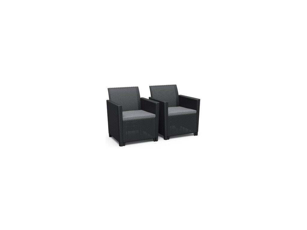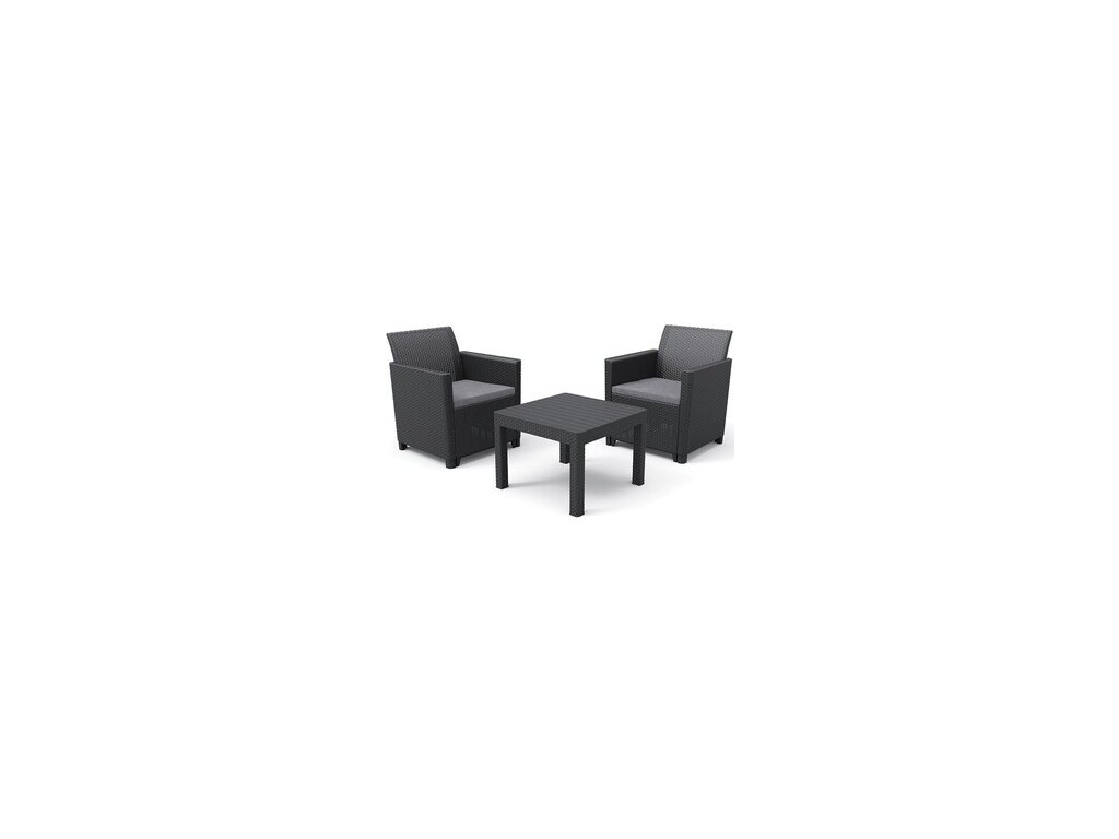 Proměňte svou terasu, balkon nebo dvorek soupravou Claire, která je vyrobena z lisovaného plastu v imitaci přírodního ratanu. Jedná se o lehký, ale zároveň pevný materiál. Souprava se skládá ze 2 křesílek a stolku. Vyznačuje se typickými hranatými liniemi a hladkými loketními opěrkami Podušky, které jsou součástí setu, poskytují pohodlí během Vašich odpočinkových chvil, stejně jako ergonomicky tvarovaná záda. Díky CLICK systému set rychle a jednoduše sestavíte. Set je velmi snadno udržovatelný a vysoce odolný proti UV paprskům a povětrnostním vlivům. Touto soupravou můžete doplnit celou řadu výrobků CLAIRE, které jsou ve stejném provedení.