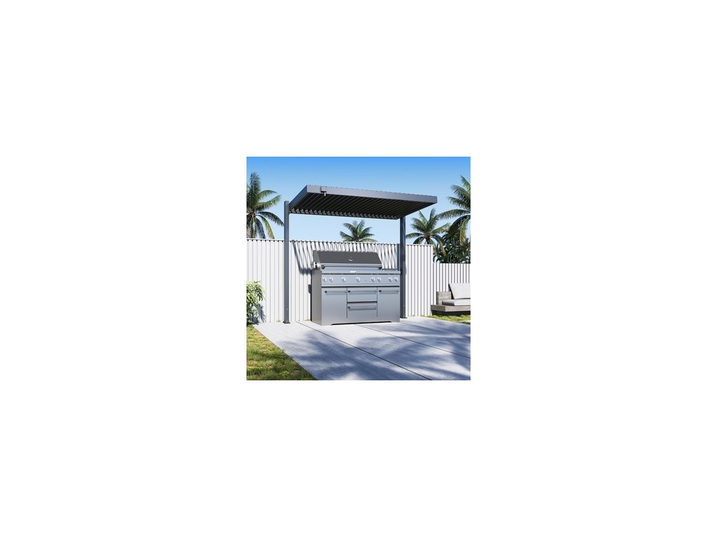 Ilustrační foto - vrchní nosník není součástí přístřešku. Elegantní design se dvěma nohami představuje minimalistický, ale zároveň moderní vzhled, který skvěle zapadne do jakéhokoli venkovního prostoru. Přístřešek na gril je vyroben ve stejném designu jako bioklimatické pergoly a přístřešky na auto. Můžete tak sladit vzhled venkovních staveb na Vašem pozemku. Správným nastavením lamel ochrání přístřešek proti slunečním paprskům, zároveň umožňuje snadnou ventilaci prostoru a naopak dokonalý přístřešek v případě deště.